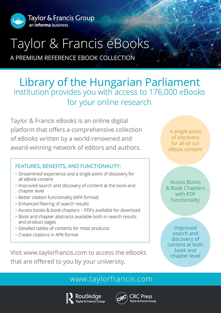 2025. szeptember 15-től 90 napon át szabadon böngészhető a könyvtárban a Taylor & Francis kiadócsoport e-könyv-adatbázisa. A tesztidőszak alatt a térítéses olvasójeggyel rendelkező olvasóink 176 ezer művet olvashatnak teljes szöveggel könyvtárunkban vagy távhozzáféréssel akár otthonról is. A multidiszciplináris gyűjteményben a legkülönfélébb területeken találhatnak forrásokat a társadalomtudományoktól kezdve a jogon át a statisztikáig. Az előbbiek egyik legjelentősebb nemzetközi kiadója, a Routledge szintén a Taylor & Francis Csoport portfólióját gazdagítja, így a tesztelés során olvasóink az ő e-könyveiket is teljes szöveggel letölthetik, illetve tematikus gyűjteményekbe rendezve is böngészhetik azokat.