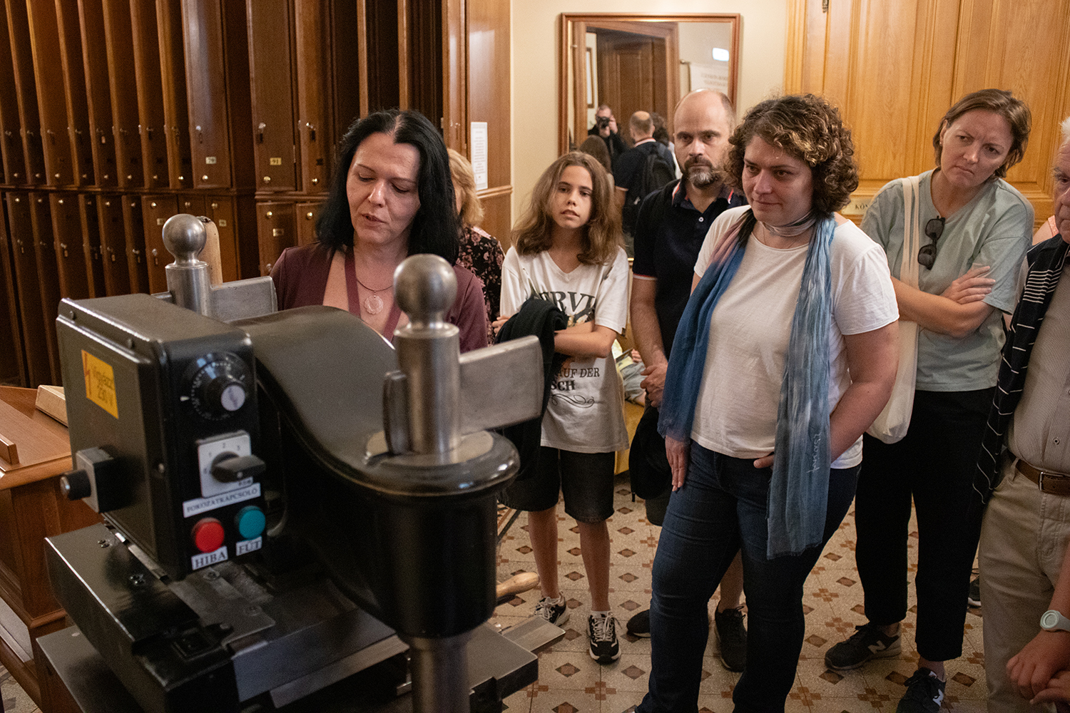 Az elmúlt évekhez hasonlóan könyvtárunk idén is részt vett a Kulturális Örökség Napjainak programsorozatában, egyedülálló alkalmat kínálva az érdeklődőknek arra, hogy betekintsenek e patinás intézmény kulisszái mögé. 2025. szeptember 20–21-én könyvtárunk olyan terei nyíltak meg a nagyközönség előtt, amelyeket csupán az év e két napján láthatnak. Vendégeink választhattak vezetett túráink közül: vagy az olvasói terekben tehettek sétát, vagy a Ghyczy Ignácz Kiállítótérben elhelyezett könyvritkaságainkat tekinthették meg. S ahogy az már ilyenkor szokásos, kipróbálhatták muzeális értékű könyvkötészeti gépeinket is.