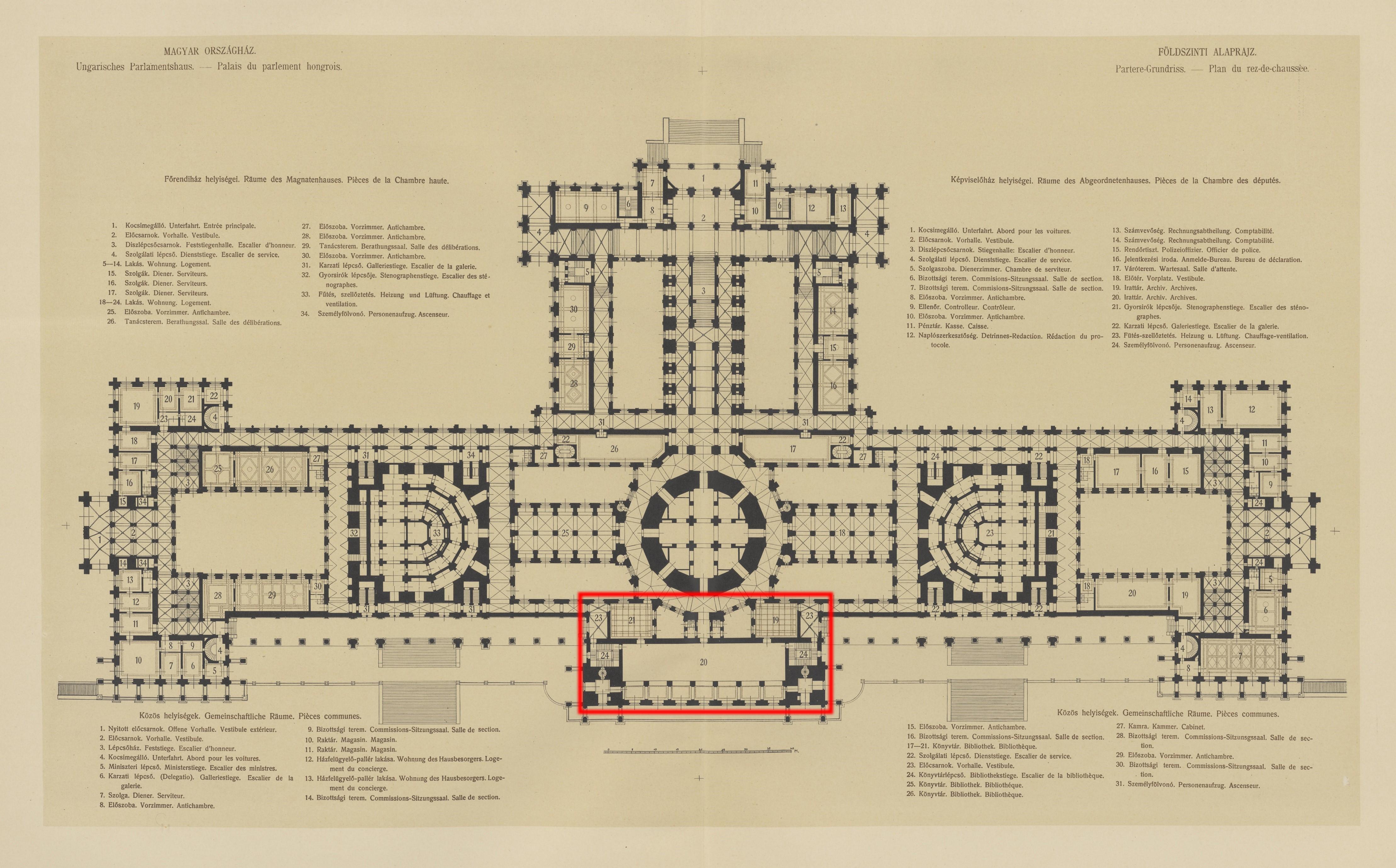 A pirossal keretezett rész a könyvtár nagy olvasótermének és egyéb helyiségeinek alaprajzát emeli ki