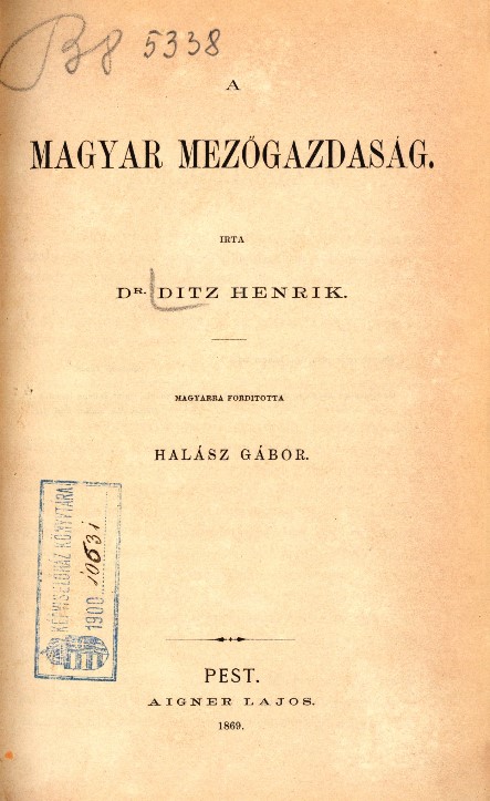 Dr. Heinrich Ditz: A magyar mezőgazdaság. ford.: Halász Gábor. Pest, Aigner Lajos, 1869.