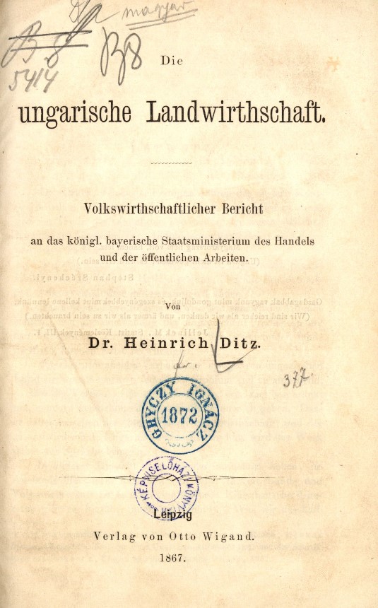 Dr. Heinrich Ditz: Die ungarische Landwirthschaft. – Volkswirtschaftlicher Bericht an das königl. bayerische Staatsministerium des Handels und der öffentlichen Arbeiten. Leipzig, Verlag von Otto Wigand, 1867.