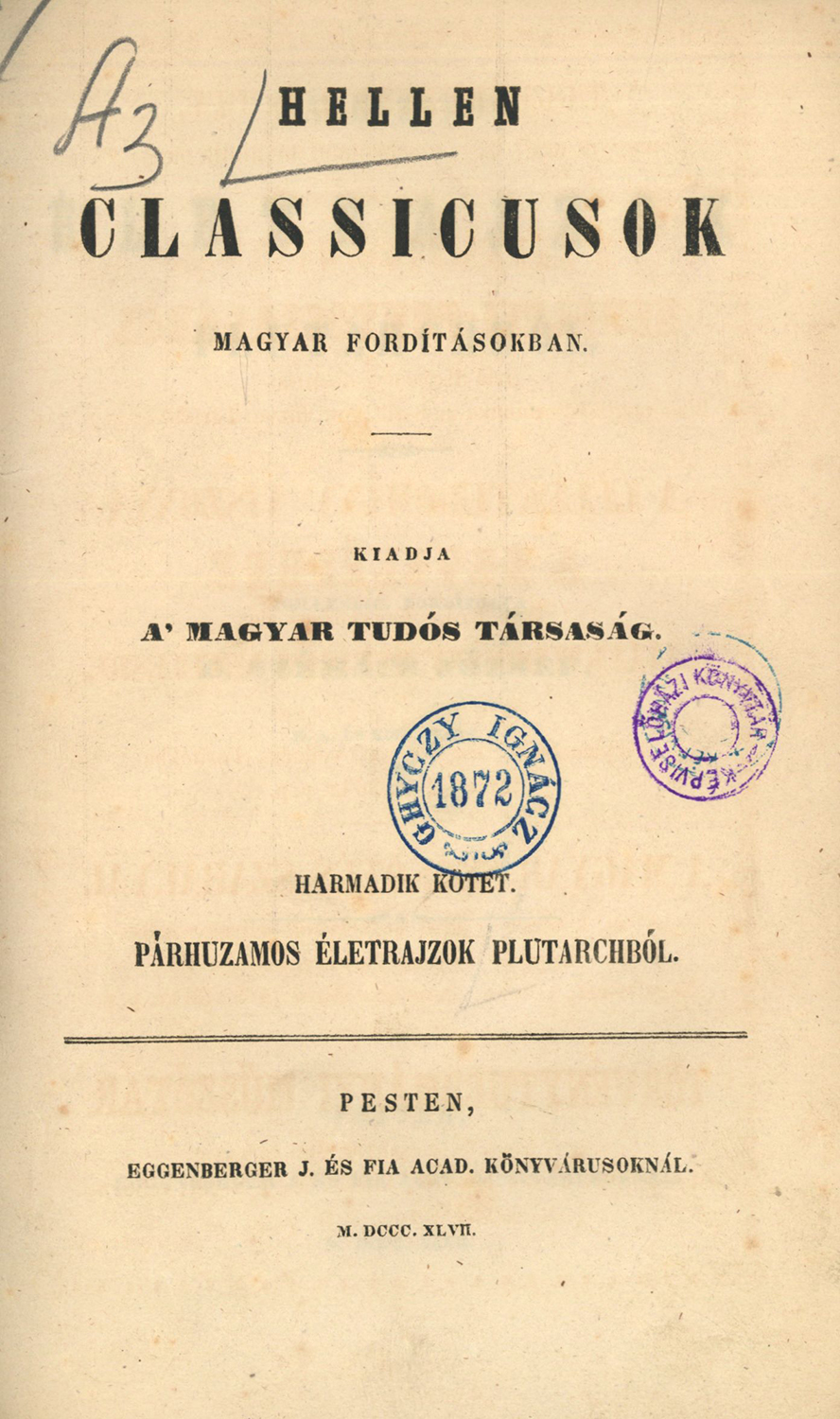Párhuzamos életrajzok Plutarchból. Pest] Pesten: Eggenberger J. és fia Acad. Könyvárusoknál, 1847. OGYK-jelzet: A3/623:3