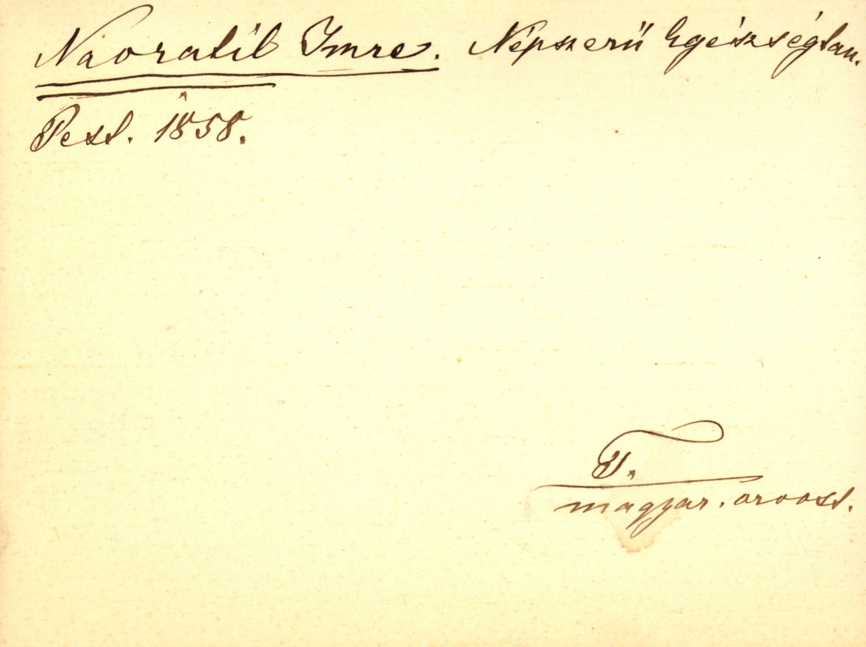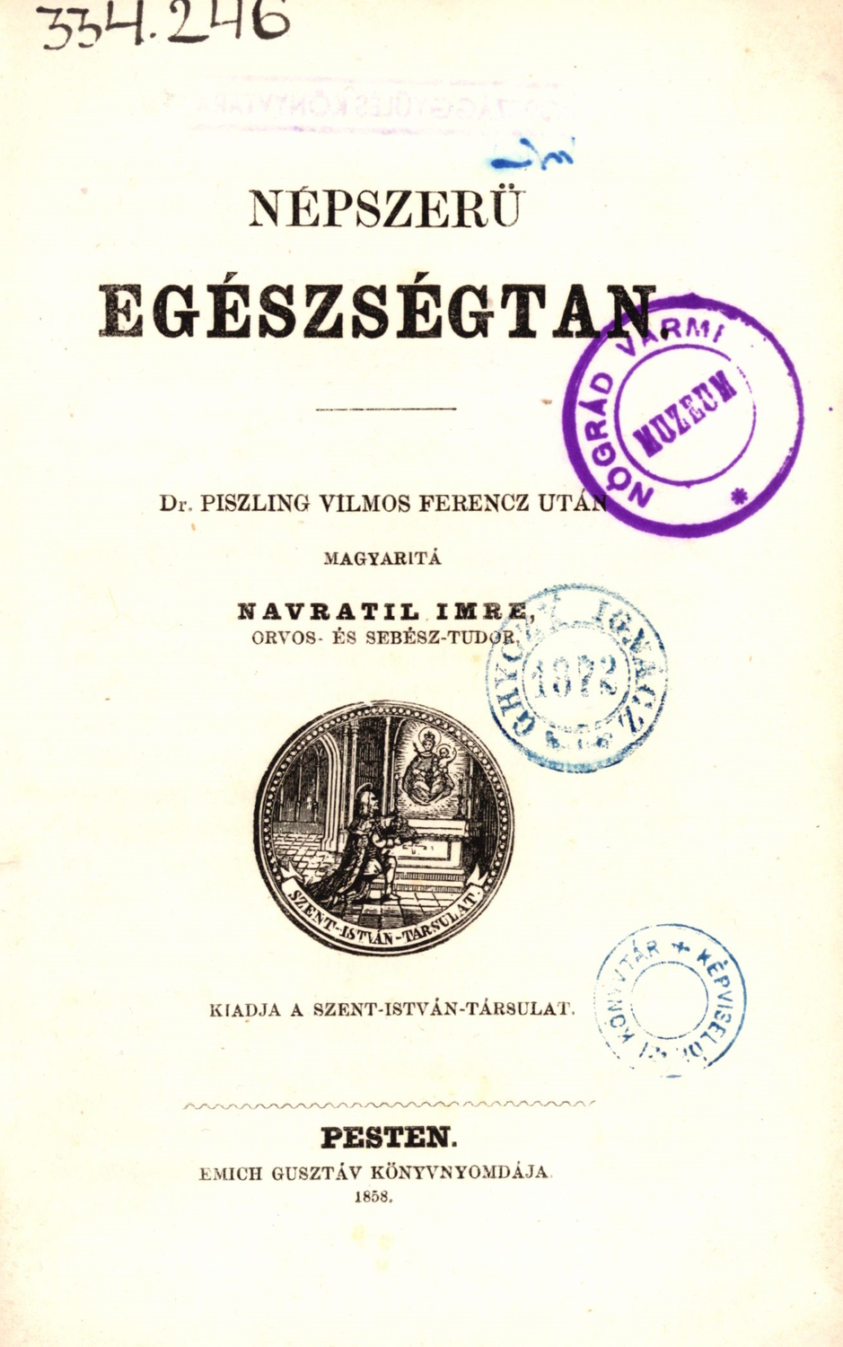 A Népszerü egészségtan (Piszling Vilmos Ferencz után magyaritá Navratil Imre ... ; kiadja a Szent-István-Társulat; [Pest] Pesten: Emich Gusztáv könyvnyomdája, 1858; raktári jelzet: 334.246) Wilhelm Franz Pissling egészségtudományi ismeretterjesztő művének Navratil Imre orvos és sebész általi fordítása. A mű két részből áll. A „Lég – Lélekzés – Vér” címet viselő első fejezet a légzést és a vérkeringést mutatja be, de a növények és az állatok légzésére is kitér. Az „Emésztés és táplálás” című második fejezet étkezési, tisztálkodási és öltözködési tanácsokat ad, egyszersmind a szellemi-erkölcsi élet rendezettségének fontosságára is felhívja a figyelmet. A kötetben egy kézzel írt, korabeli katalóguscédulát találtunk.
