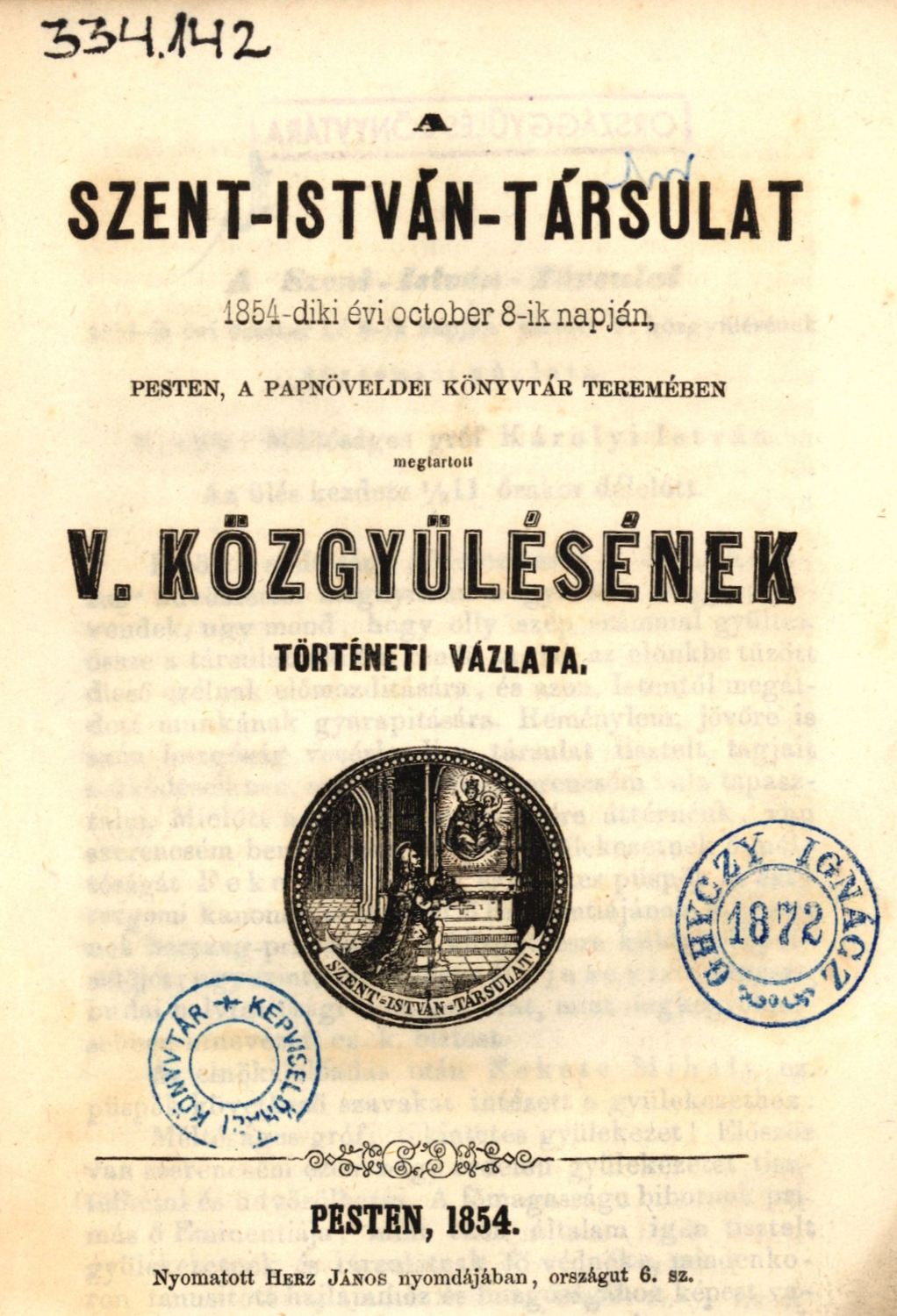 A legrégebbi társulati jegyzőkönyvünk A Szent-István-Társulat 1854-diki évi october 8-ik napján, Pesten, a Papnöveldei Könyvtár teremében megtartott V. közgyülésének történeti vázlata címet viseli ([Pest] Pesten: nyomatott Herz János nyomdájában, 1854; raktári jelzet: 334.142). A jegyzőkönyvön kívül a kötet tartalmazza Fekete Mihály püspök, kanonok megbízólevelét Scitovszky János bíboros, hercegprímás, esztergomi érsek közgyűlésen való helyettesítésére, a cs. kir. helytartóság közgyűlés tartását engedélyező és Bujanovics Ernő országfejedelmi biztost kinevező dokumentumát. A kötetben megtalálható a közgyűlésen tett elnöki jelentés szövege, a Szent István Társulatot megerősítő kormányzati leirat (1854. február 18.), a társulat 1854. május 4-én felterjesztett alapszabálya, a társulat 1853-as állása magyar és német nyelven, a társulati igazgató jelentése, a társulati kiadványokból származó bevételek jegyzéke, Novákovics János pénztárnoki jelentése, az 1853. augusztus 27. és 1854. szeptember 30. között a Szent István Társulathoz beadott kéziratok jegyzéke, Szabóky Antal és Lonkay Antal szerkesztők magyar Olvasó-könyvről szóló jelentése, valamint a társulati névkönyv.