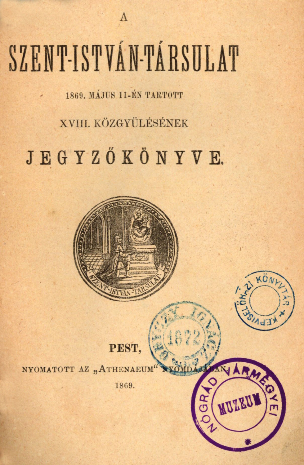 A Szent-István-Társulat 1869. május 11-én tartott XVIII. közgyülésének jegyzőkönyve (Pest: nyomatott az "Athenaeum" Nyomdájában, 1869; raktári jelzet: 334.032) című kötet a közgyűlés jegyzőkönyvével kezdődik Ágoston Antal titkár tollából. A kötetben olvasható Simor János hercegprímás megnyitó beszéde, Pollák János kanonok alelnöki előadása, az igazgatói, pénztári, titkári és ügynökségi jelentés, az adakozásokra és végrendeleti hagyatékokra vonatkozó titkári kimutatások, valamint a társulati névkönyv.