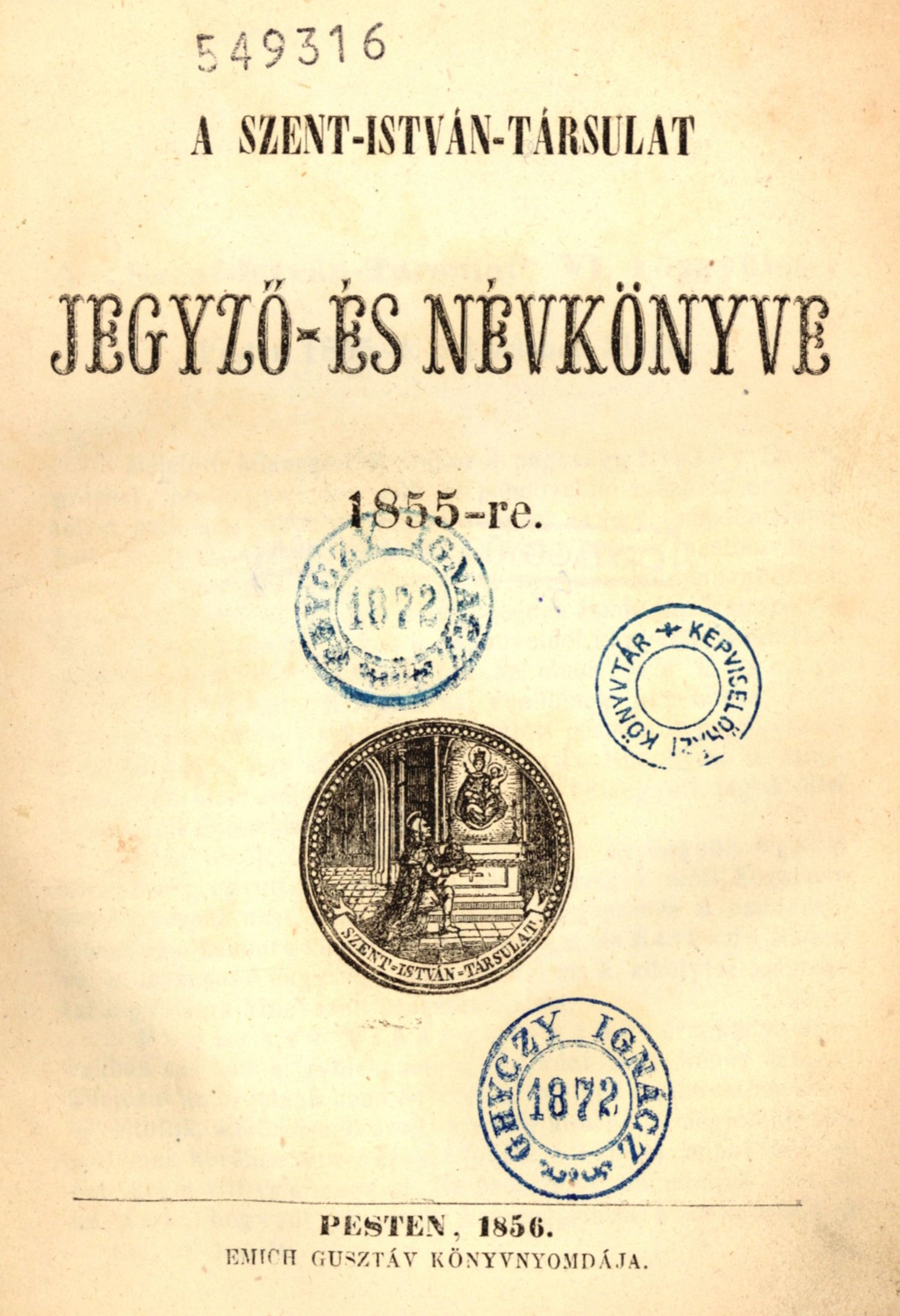 A Szent-István-Társulat jegyző- és névkönyve 1855-re ([Pest] Pesten: Emich Gusztáv könyvnyomdája, 1856; raktári jelzet: 549.316) tartalmazza a társulat 1855. október 11-én megtartott VI. közgyűlésének vázlatát, a közgyűlésen tett elnöki, igazgatói és titoknoki jelentést, az 1854. október 1. és 1855. október 8. közötti pénztári állapotot, a társulati kiadványokból származó bevételek jegyzékét, Majer István Pázmány-füzetekről szóló szerkesztői jelentését, a Magyarországon és Erdélyben található latin, magyar, német és szláv nyelvű imakönyvek jegyzékét, az énekgyűjtő bizottmány jelentését a beérkezett küldeményekről, valamint a társulati névkönyvet.