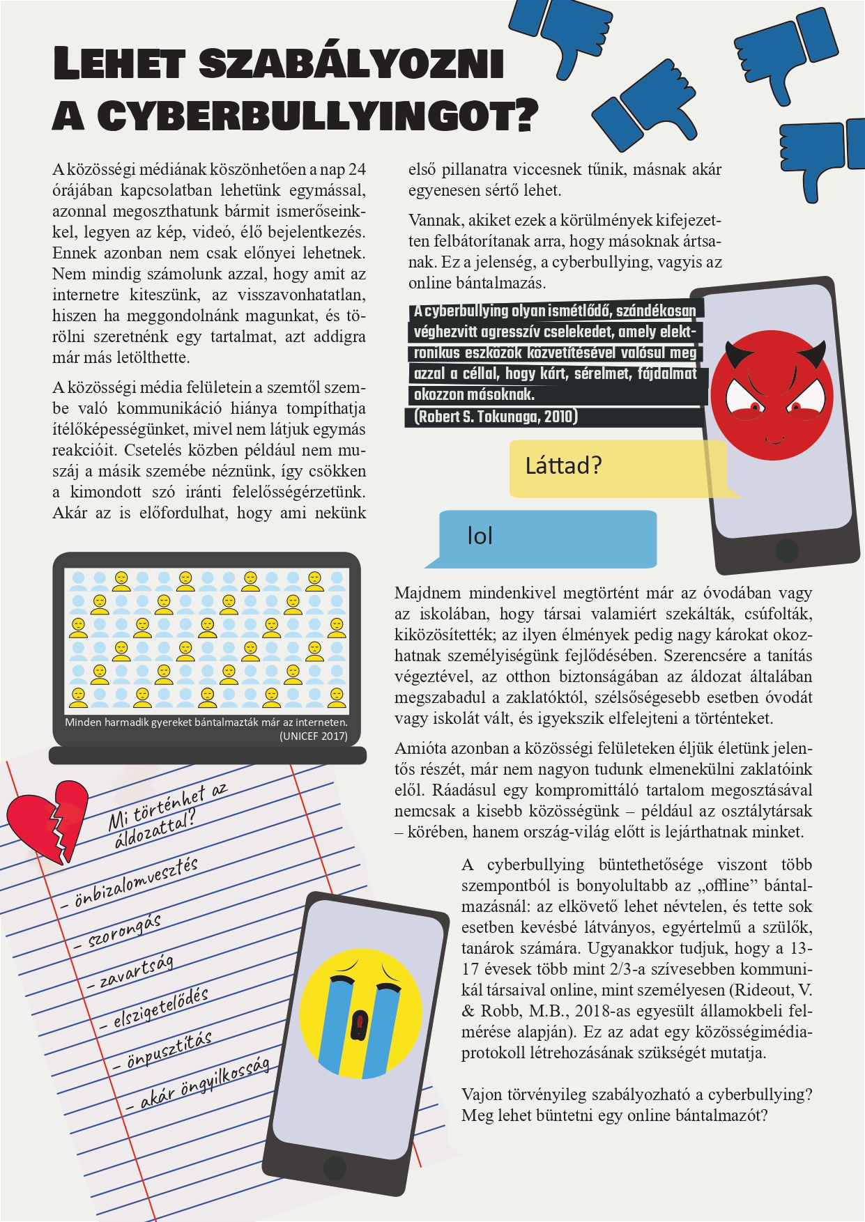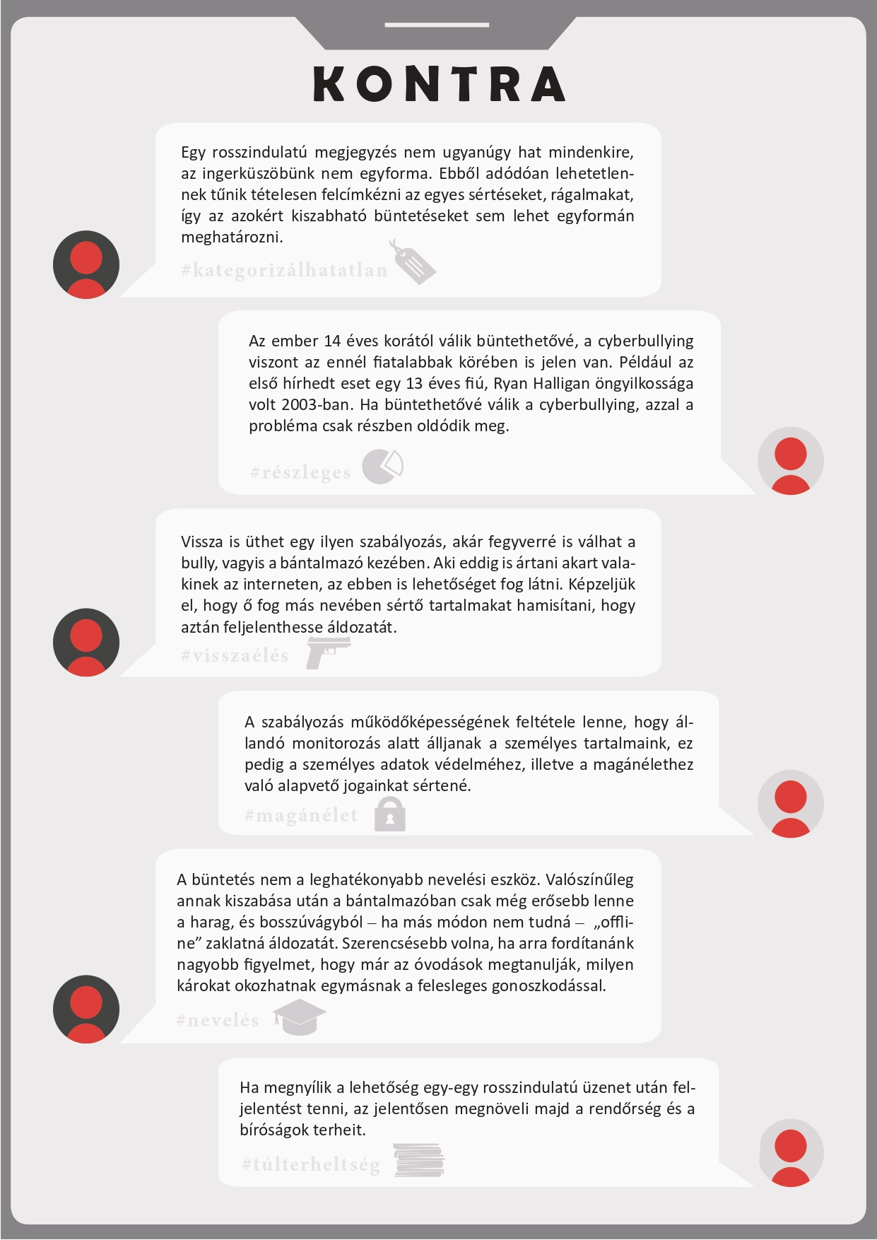 Pro és kontra érveket tartalmazó tablók A tablók az álláspontok kialakításában nyújtanak segítséget: a mellett és az ellen sorakoztatnak fel érveket, hogy a megvalósítható-e az online bántalmazás törvényileg történő szabályozása. Letöltésükhöz kattintson a képekre! |