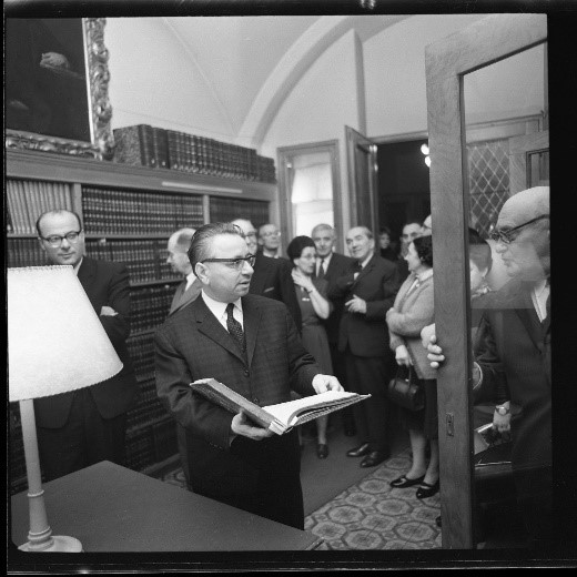 A könyvtár fennállásának 100. évfordulóján, 1968-ban Kállai Gyula az országgyűlés elnöke a gyűjtemény dokumentumait nézi