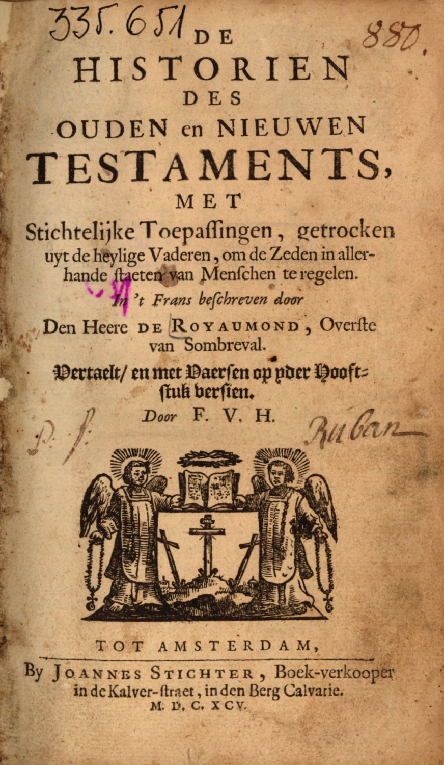[1] De historien des Ouden en Nieuwen Testaments, met stichtelijke Toepassingen, getrocken uyt de heylige Vaderen, om de Zeden in allerhande staeten van Menschente regelen. In't Frans beschreven door den Heere de Royaumond. / Fontaine, Nicolas. [Amsterdam] Tot Amsterdam: [Stichter] By Joannes Stichter, 1695. [8], 613, [3] p.