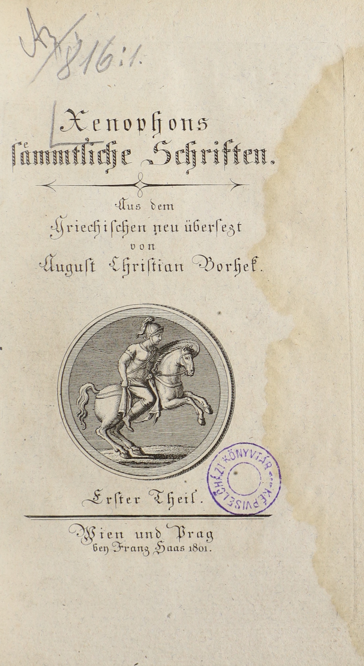 []Xenophons sämmtliche Schriften : 1-4. Theil / Xenophón. [Bécs] Wien; [Prága] Prag : bey Franz Haas, 1801. OGYK jelzet: A3/816:1-4
