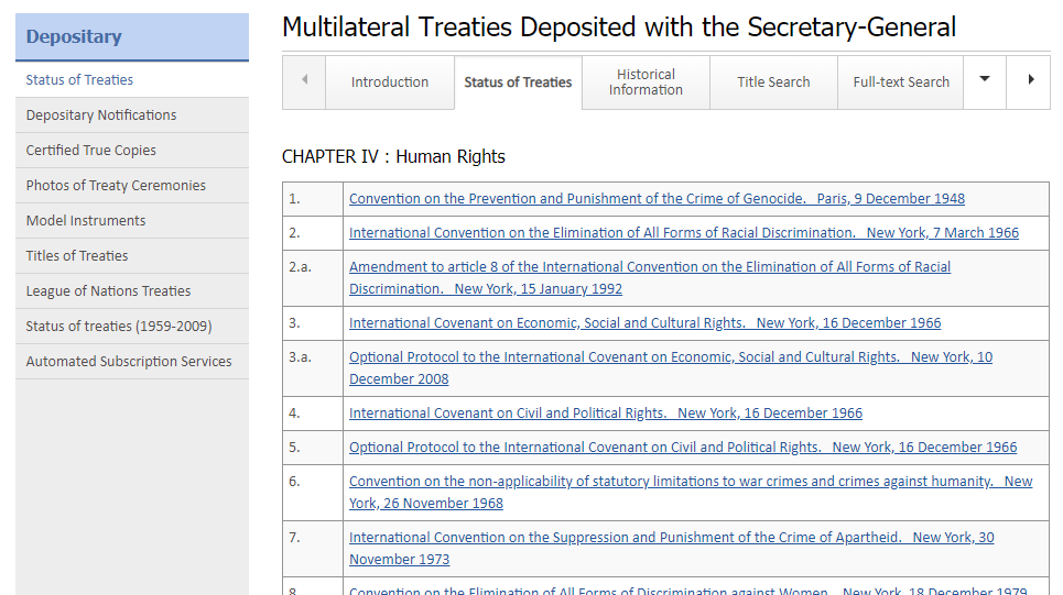 10. Az ENSZ és a Népszövetség bi- és multilaterális egyezményeinek közös keresője. A legfrissebb egyezmények a címoldalon találhatók, de az archívum is kereshető visszamenőleg 1945-ig. Külön menüpontból fedezhetők fel a Népszövetség egyezményei az egyes országok ratifikációs dátumaival egyetemben. Kereshetünk az egyezmények státusára is, azaz megtudhatjuk, hogy az ENSZ Alapokmányának egyes fejezetéhez kapcsolódóan milyen további egyezmények születtek.